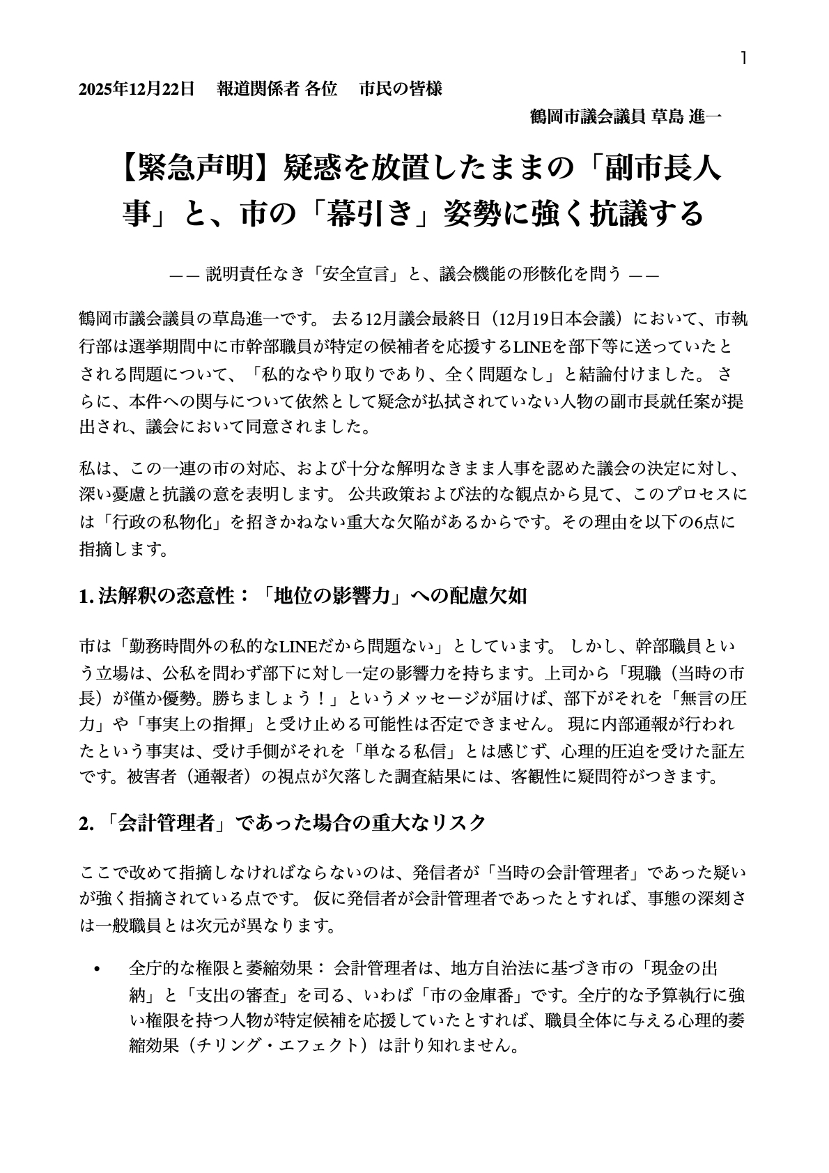 を超えて公共福祉を実現し、市民の声に応え、そして鶴岡市の未来を切り拓